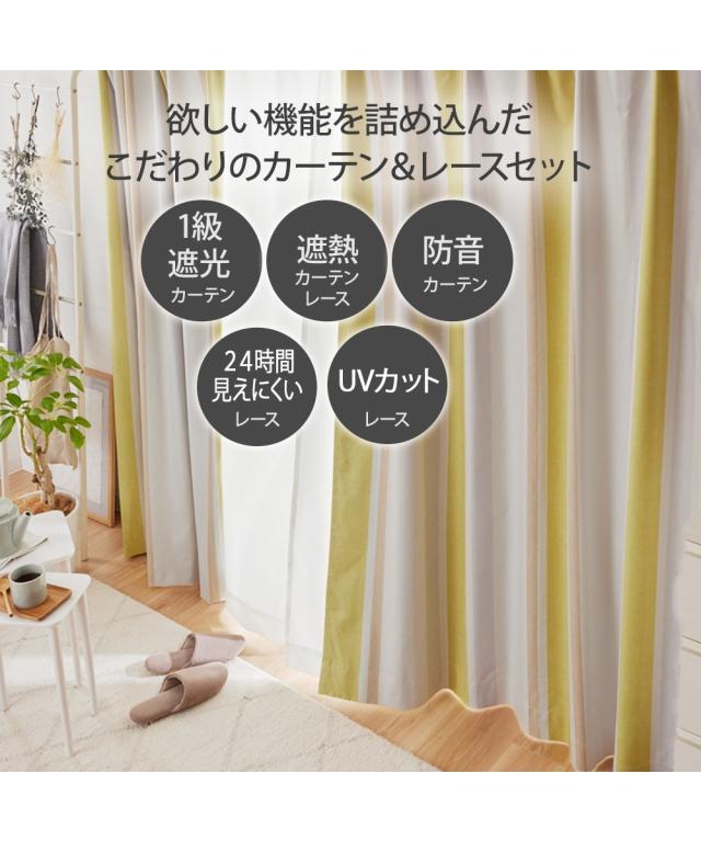 1級遮光・遮熱・防音カーテン&遮像・遮熱・UVカットレースセット(ナチュラルな色合いのストライプ)