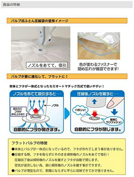 [備考] ●お手入れの不十分なものを収納しますと、圧縮袋のファスナー、バルブ部分、フィルム内面など密閉する為の主要部分にゴミやほこり、髪の毛などが付着しこれらが密閉を阻害し空気が入ってしまう事が起こります。また臭いの発生する原因にもなりますので、圧縮収納する際は収納物を十分にお手入れしてから行って下さい。