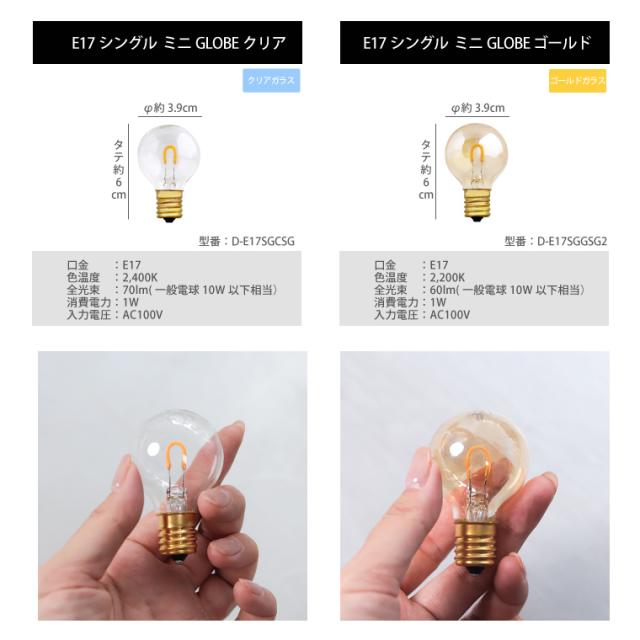 ・E26シングルロングゴールド[型番:D-E26BGSG] ・E26シングルGLOBEゴールド[型番:D-E26GGSG] ・E26シングルミニGLOBEクリア[型番:D-E26MGCSG] ・E17シングルミニGLOBEクリア[型番:D-E17SGCSG] ・E17シングルミニGLOBEゴールド[型番:D-E17SGGSG2] |