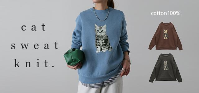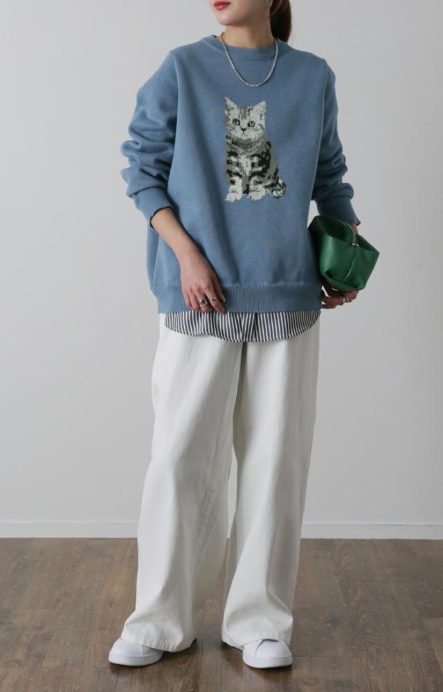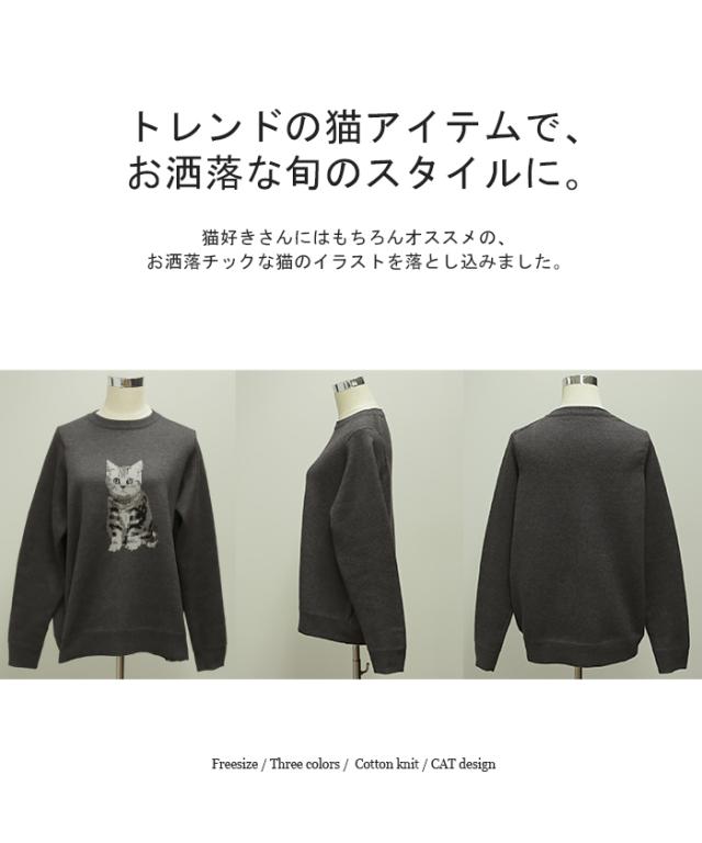 ネコ好きにはたまらない可愛らしいネコモチーフが目を惹くニットトップスです。