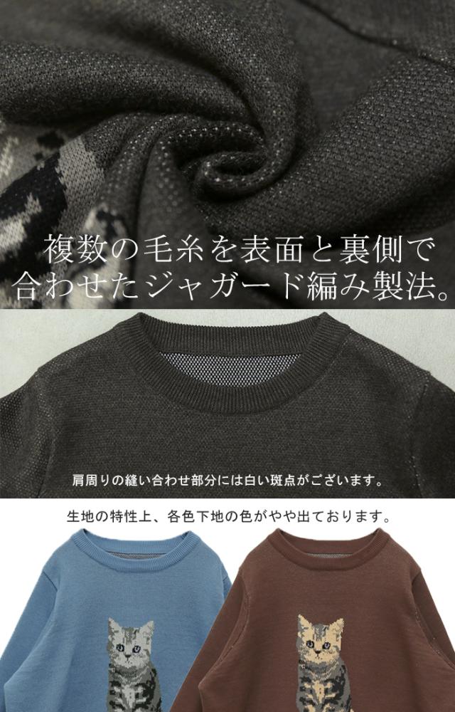 「 ニャンと可愛い。」愛猫 ニット スウェット 猫 ネコ イラスト モチーフ クルーネック プルオーバー レディース セーター トップス 長袖 丸首 お洒落 チクチクしない レイヤード 体型カバー ジャガード リブ 青 冬 秋 HUG.U 秋新作