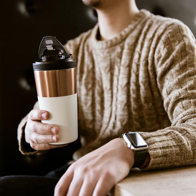 ステンレスの素材感を活かした高級感のあるデザイン。真空断熱二重構造で飲み物の温度をしっかりキープし、持ち歩いてもこぼれにくいロック機能など高い機能性が備わったアイテムです。