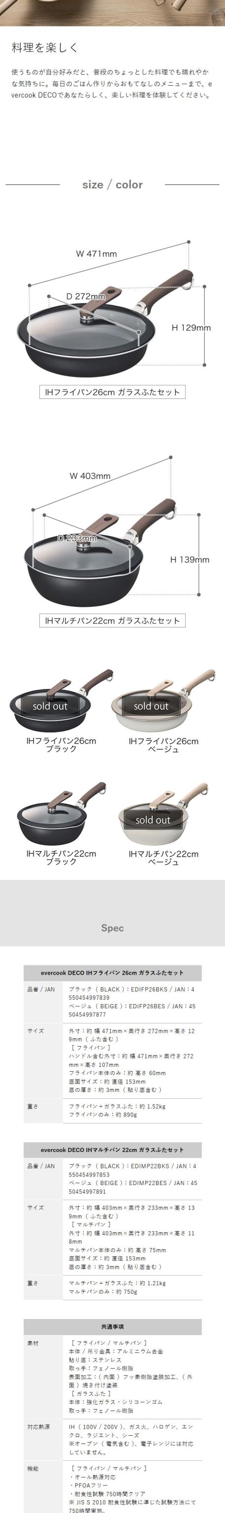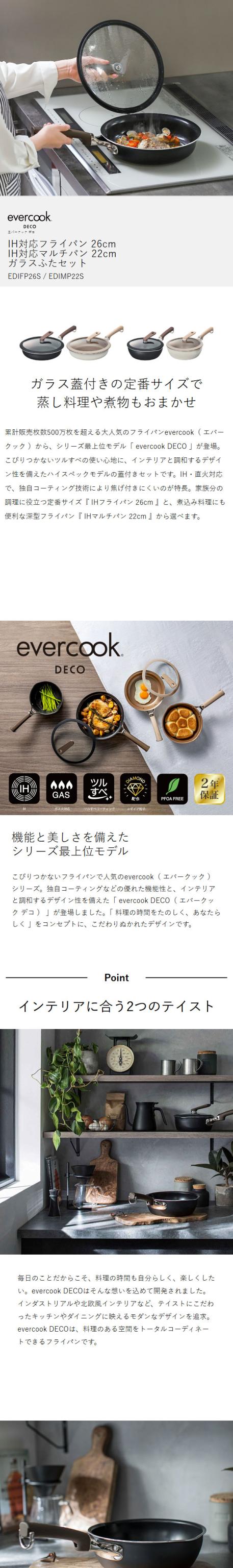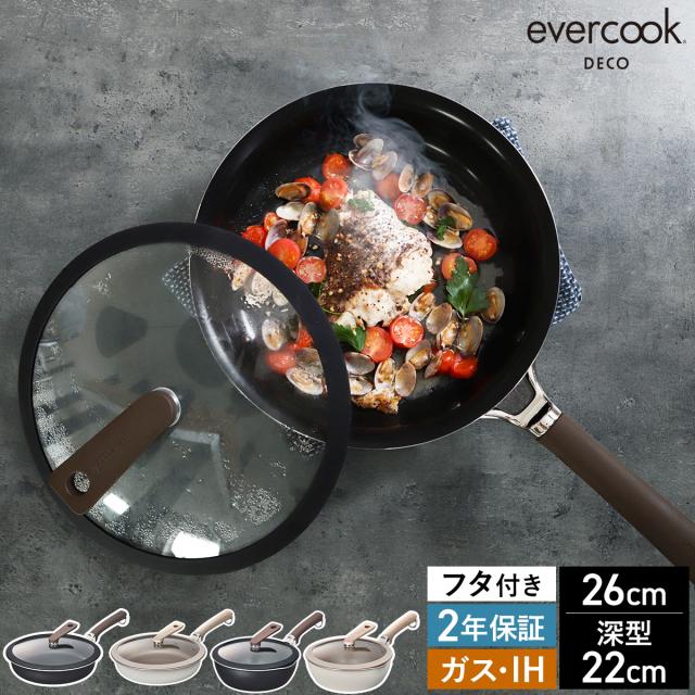 [ evercook DECO ガラスふたセット フライパン 26cm / マルチパン 22cm ]エバークック最高峰モデル 26cmフライパン 22cmマルチパン 蓋付き IH対応 ガス火対応 フライパン 深型 フタ付 焦げ付かない 2年保証 おしゃれ エバークックデコ EDIFP26S EDIMP22