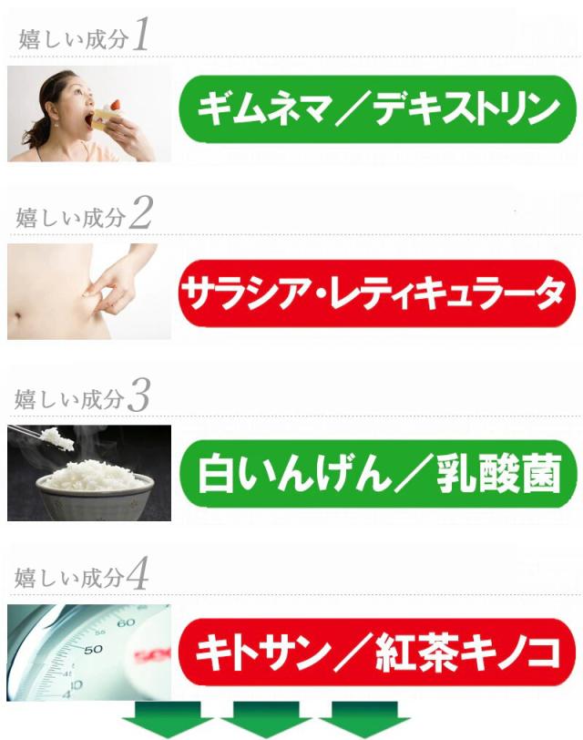 成分 還元麦芽糖水飴(国内製造)、白インゲン豆抽出物、マ ルトデキストリン、デキストリン、発酵紅茶エキス、ギ ムネマエキス末、サラシアエキス、乳酸菌(殺菌)(乳 成分を含む)/粉末セルロース、キトサン/(カニ由 来)、ステアリン酸Ca、微粒二酸化ケイ素