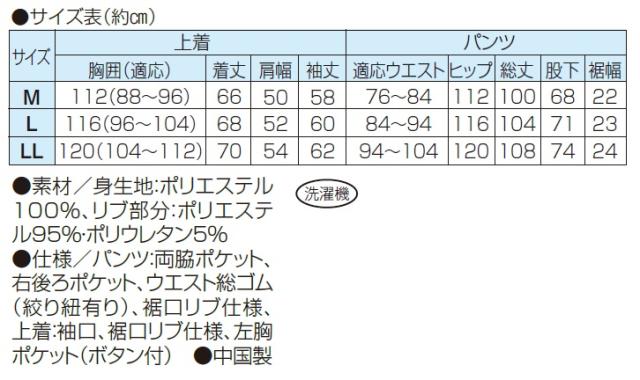 ●仕様/パンツ:両脇ポケット、右後ろポケット、ウエスト総ゴム(絞り紐有り)、裾口リブ仕様、上着:袖口、裾口リブ仕様、左胸ポケット(ボタン付)