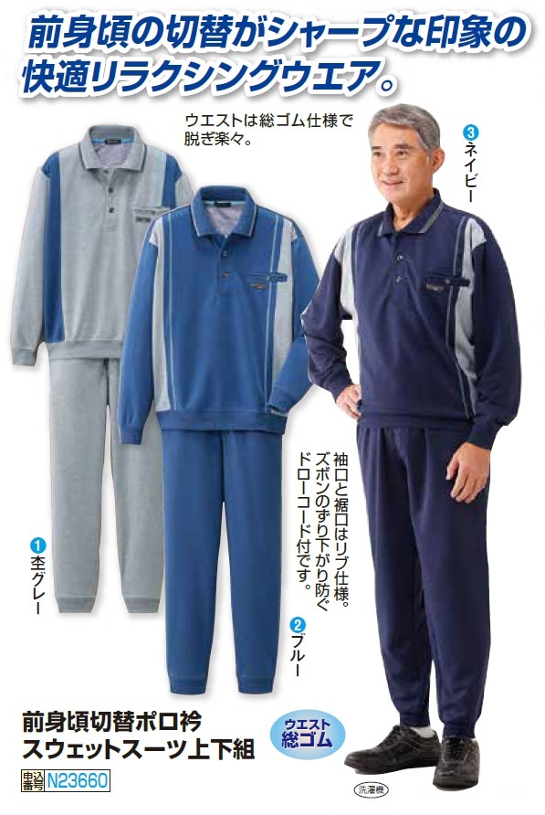 ホームウェア 前身頃切替ポロ衿スウェットスーツ上下組 全3色 スウェットスーツ ルームウェア グレー ブルー ネイビー メンズ 紳士服 シニア 男性 シニアファッション 50代 60代 70代 80代 父の日 お父さん シンプル 部屋着 上下セット スウェットプルオーバー パンツ ズボン 灰色 紺色 青