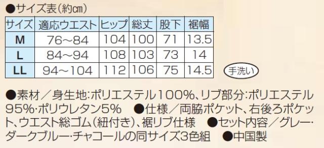 ●仕様/両脇ポケット、右後ろポケット、ウエスト総ゴム(紐付き)、裾リブ仕様