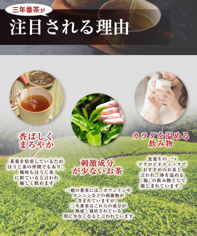 - 三年番茶は飲んで美味しいしとてもまろやかな口当たりで家族で戴いております。 有り難うございました。
