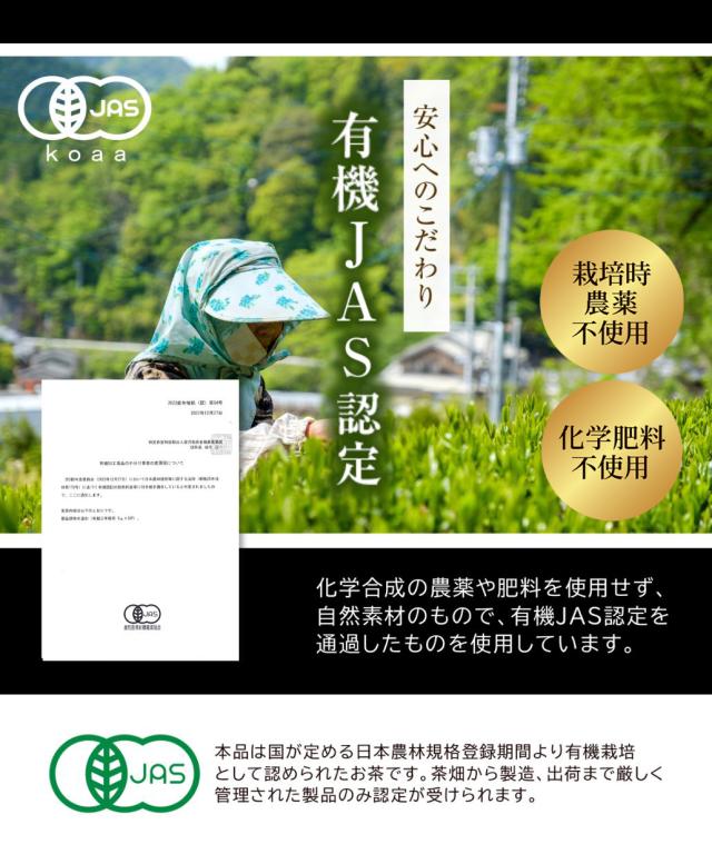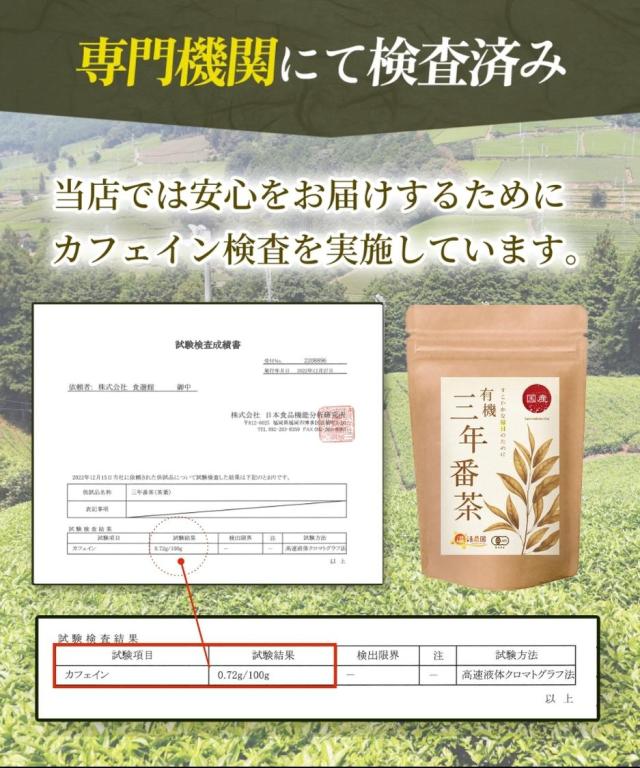 緑茶の茶葉と茎を乾燥させ、長時間熟成期間を経ることで、まろやかな風味になるのが特長です。国内の有機JAS認証工場で充填。 【専門機関にてカフェイン検査済み】検査結果:100g中/0.72g |