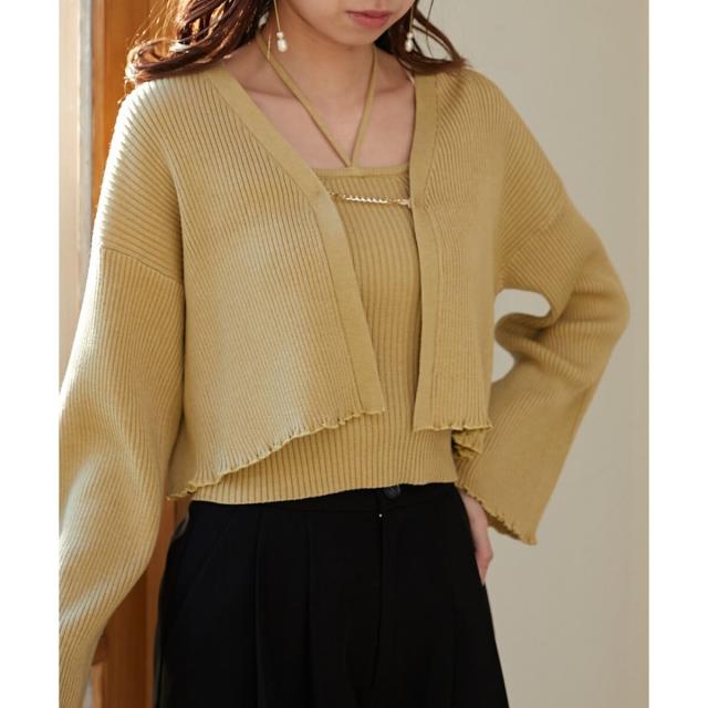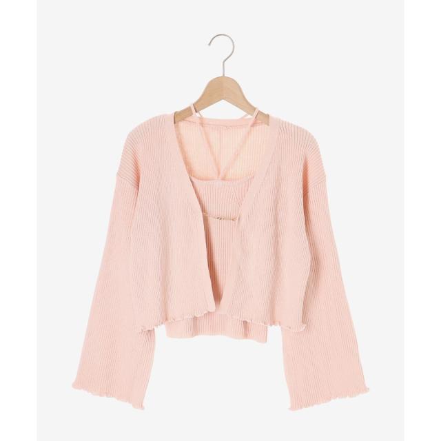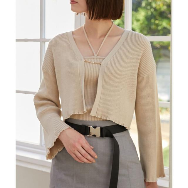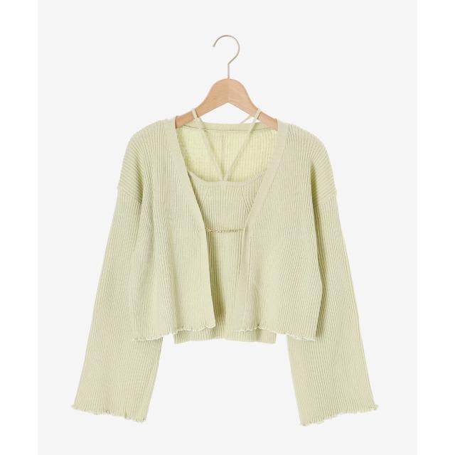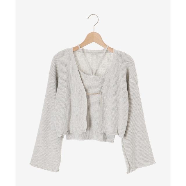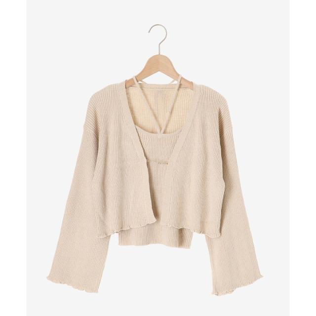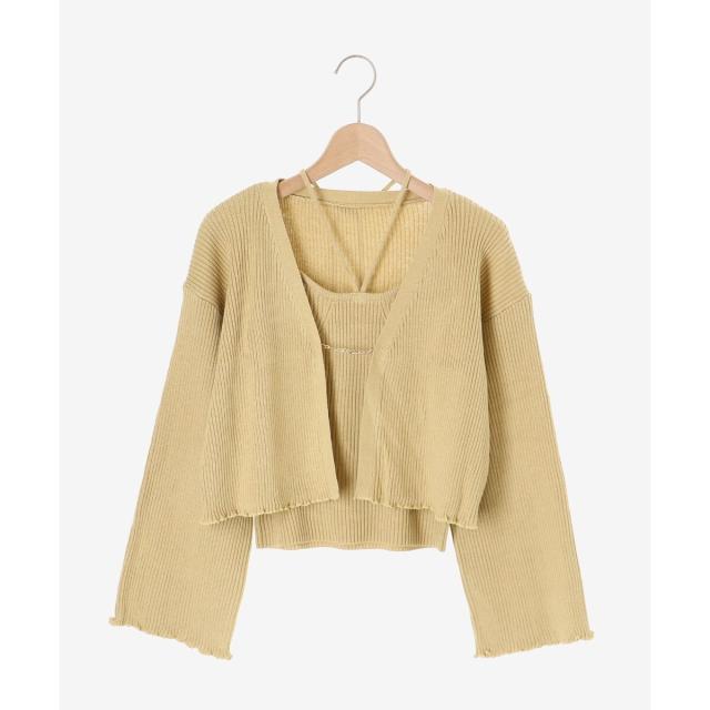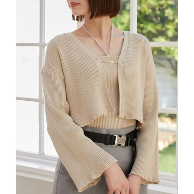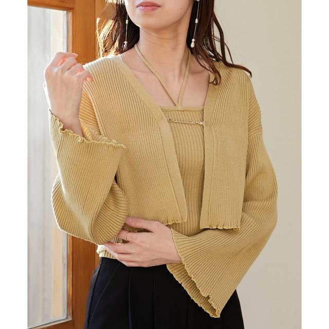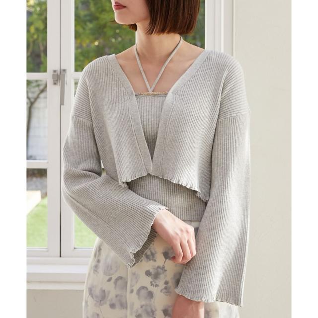 旬のフレアスリーブデザインのカーディガンと同素材のキャミインナーがセットになったアンサンブル。