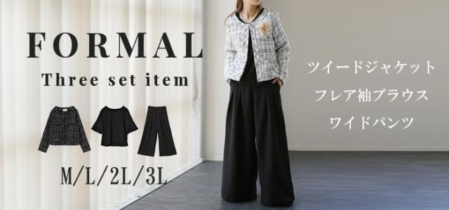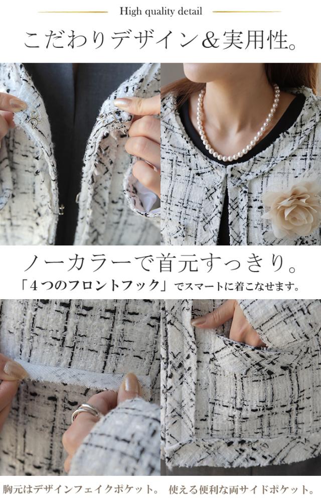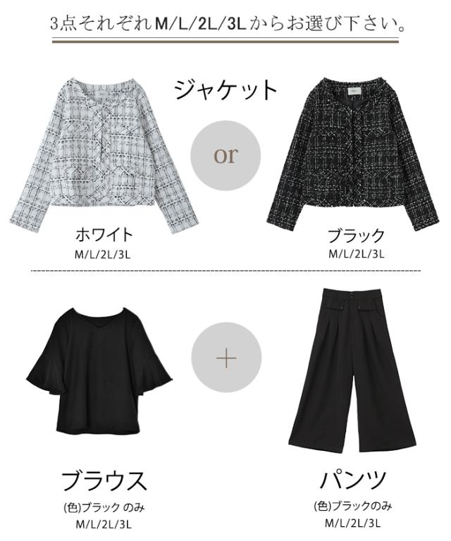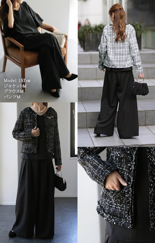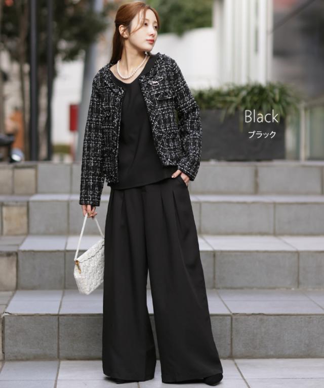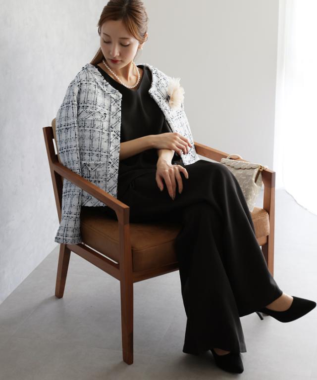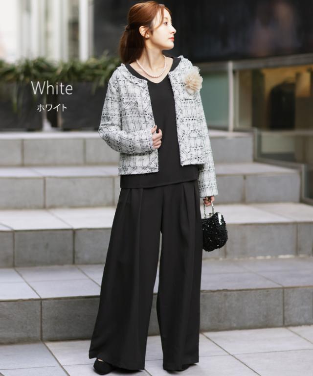 上下セット オケージョン セレモニー スタイル 三点セット セットアップスーツ アウター フォーマルスーツ セレモニースーツ ドレス ワイド ワイドパンツ ジャケット バックシャン パーティー 卒園式 卒業式 入学式 入園式 ドレッシー パーティー ツイード素材 黒 白 ブラック ホワイト 結婚式 冠婚葬祭 お宮参り 七五三 発表会 懇親会 お呼ばれ 参観日 仕事服 仕事 仕事用 学校行事 お仕事 母 ママ 母親 服装 セレモニー デート 女子会 発表会 衣装 モテ ミセス 着痩せ 体型カバー
