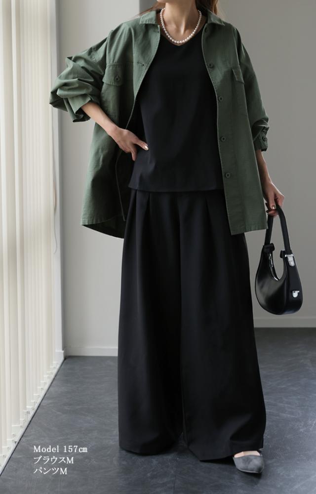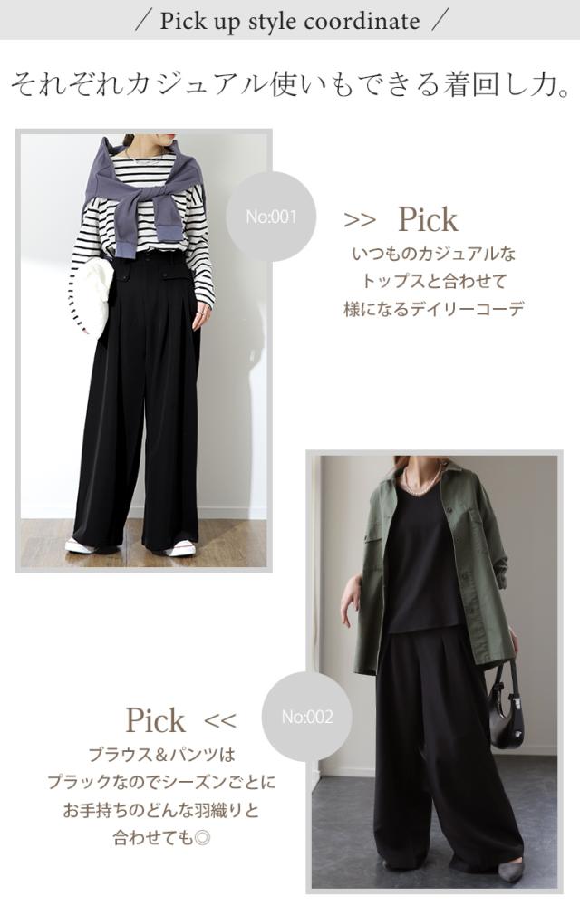 1セットで着回し多彩なブラウスとジャケット、ワイドパンツのセットアップ。