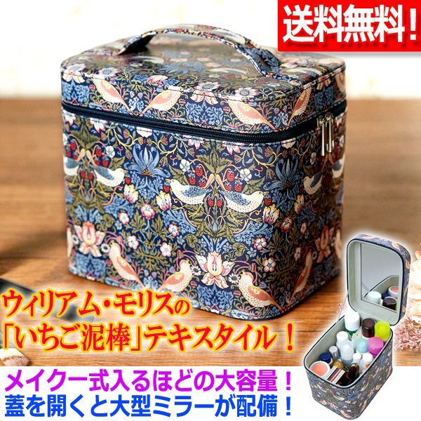 ウィリアム・モリスの「いちご泥棒」ミラー付きコスメボックス( 化粧ケース 持ち運び メイクBOX 大容量 大型ミラー レディース)
