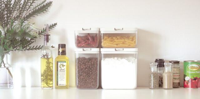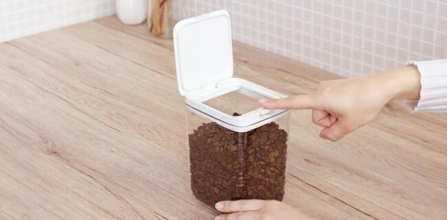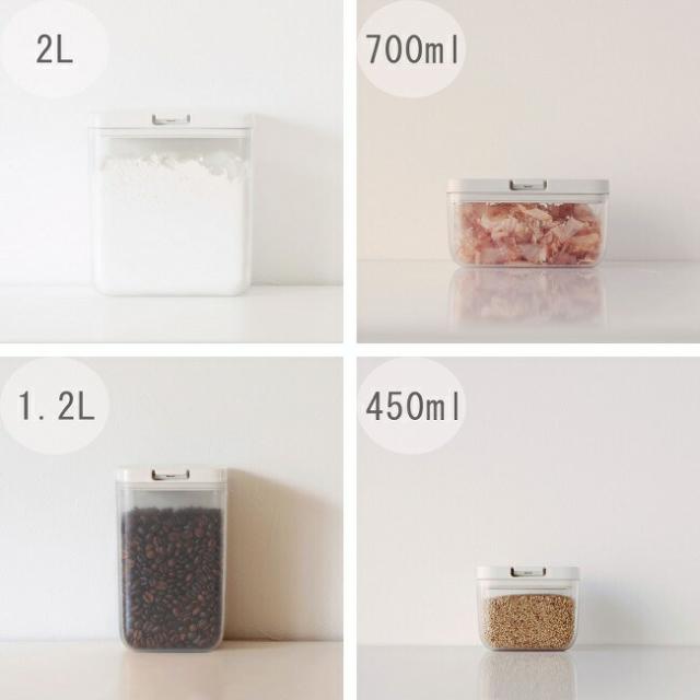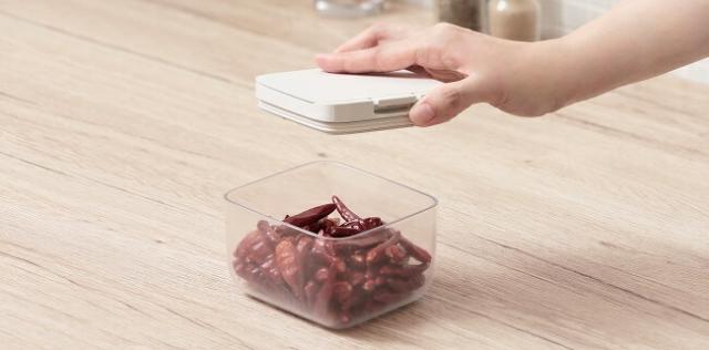 パッキンでしっかり閉まって湿気を防ぎ、ワンタッチで開く保存容器。