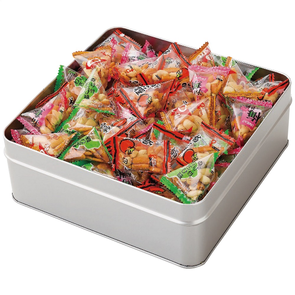 4種類の柿の種(醤油味・わさび味・梅味・カレー味)にピーナッツを組み合わせた柿ピーの詰合せ商品です。テトラタイプの個包装に仕上げております。また窒素ガスを充填しております。缶入りとなっております。