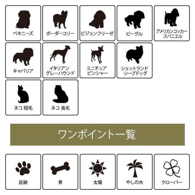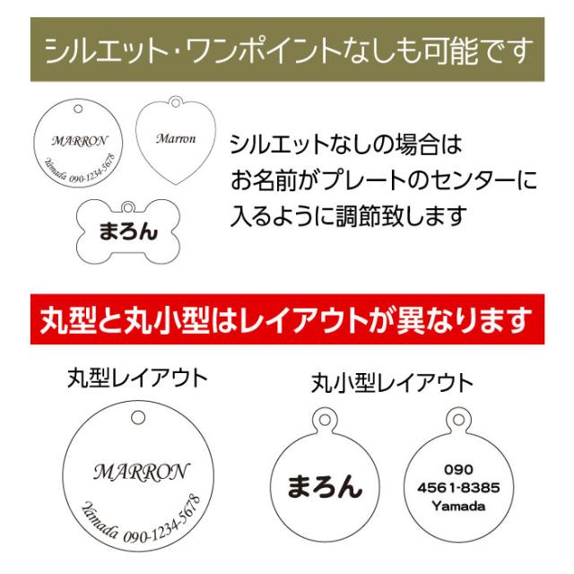 | 刻印について | 1.ペットのお名前 2.シルエットorワンポイント 3.飼い主様のお名前とご連絡先 シルエットorワンポイントは刻印ナシも可能です |