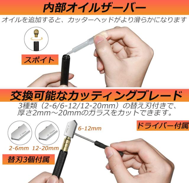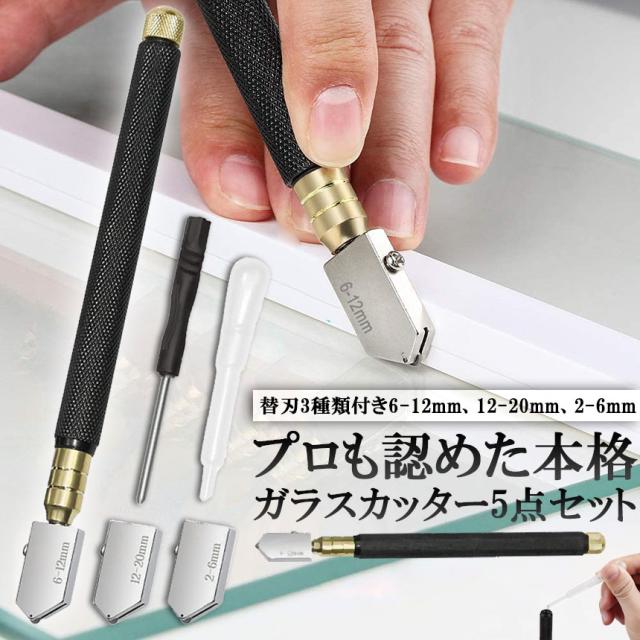 ガラスカッター オイル式 替刃 5点セット イル補充 ミラータイルカット 硝子カッター スポイト スポイド 超硬ガラス 切削工具 ローラータイプ 替刃 2-6mm 6-12mm 12-20mm オイル式ガラスカッター 切削工具 滑り止め 簡単操作