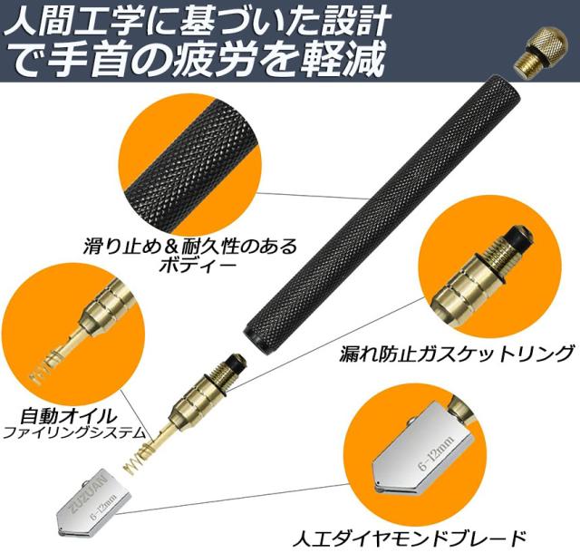 【素材】ガラスをカットするためにデザインした、人間工学を基づいて作り上げたアルミ合金製ハンドルです。もっと気軽に使えます。刃はタングステン鋼を採用し、デジタルコントロール精密機械によって作られました。