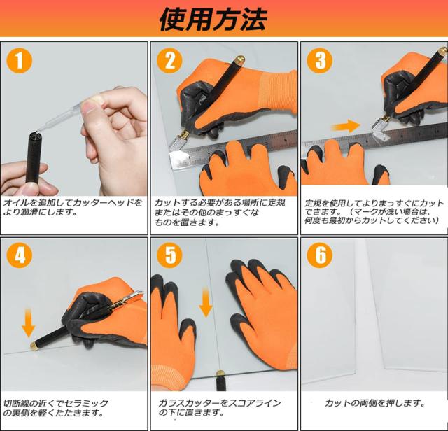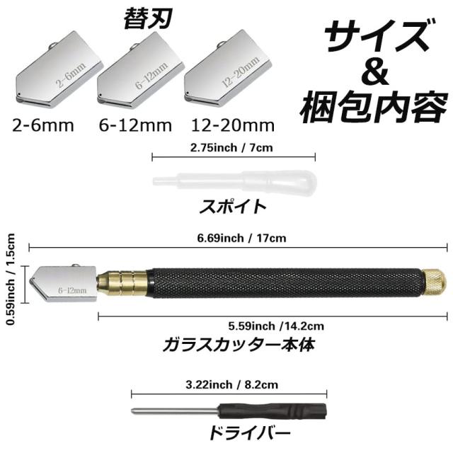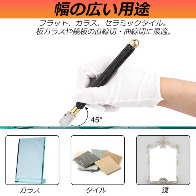 【商品仕様】5点セット。カッターペン6-12mm*1、ドライバー*1、ドロップパイプ*1、ブレード2-6mm、12-20mm。材質:アルミ合金、タングステン鋼。【素材】ガラスをカットするためにデザインした、人間工学を基づいて作り上げたアルミ合金製ハンドルです。もっと気軽に使えます。刃はタングステン鋼を採用し、デジタルコントロール精密機械によって作られました。