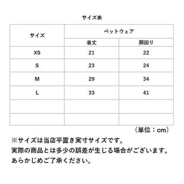 | サイズ | [ペットウェア] ・XSサイズ ・Sサイズ ・Mサイズ ・Lサイズ ※サイズについて詳細は、商品画像の中にあるサイズ表をご覧くださいませ。 |