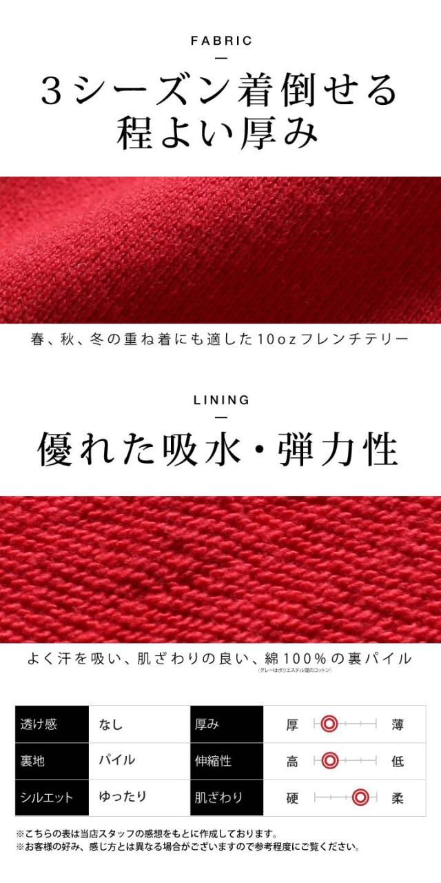 洗濯しても色落ち・色あせ・型くずれしにくく、耐久性にも優れています。秋冬には、裾のゴムリブにより、遮風性・保温性をしっかりメイク。体温を逃がさず暖かさを持続してくれます。