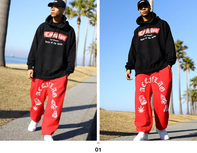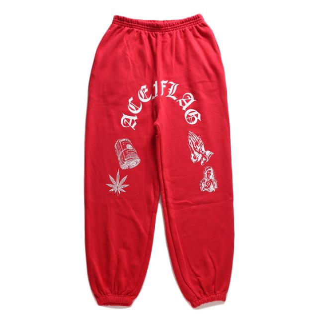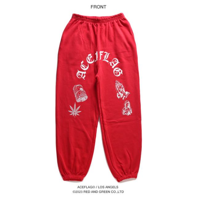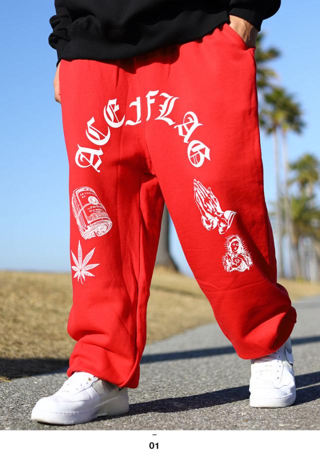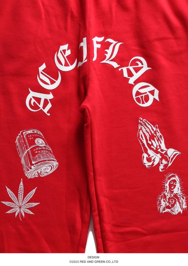 ACEFLAG スウェットパンツ 裏パイル メンズ 赤 大きいサイズ エースフラッグ スウェット ロングパンツ ゆったり おしゃれ 総柄 ドル柄 大麻 祈り手 マリア ギャング文字 ギャング b系 ダンス ストリート系 ブランド AF-LP-SW-032