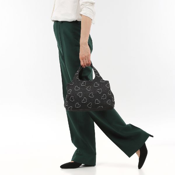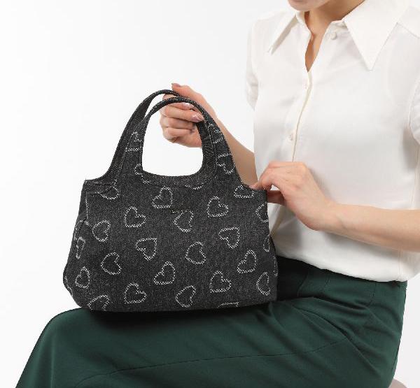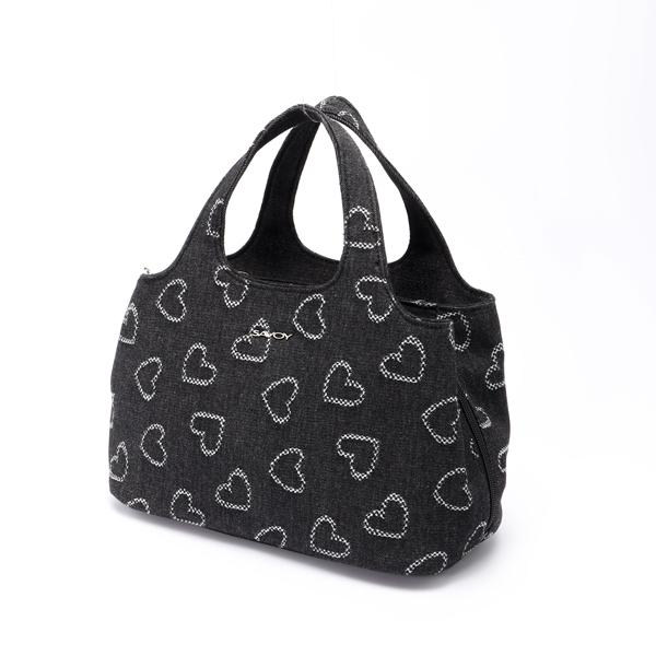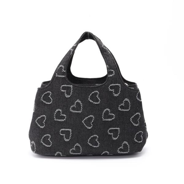 デニム素材にハートの模様が入った可愛らしいバッグ。
