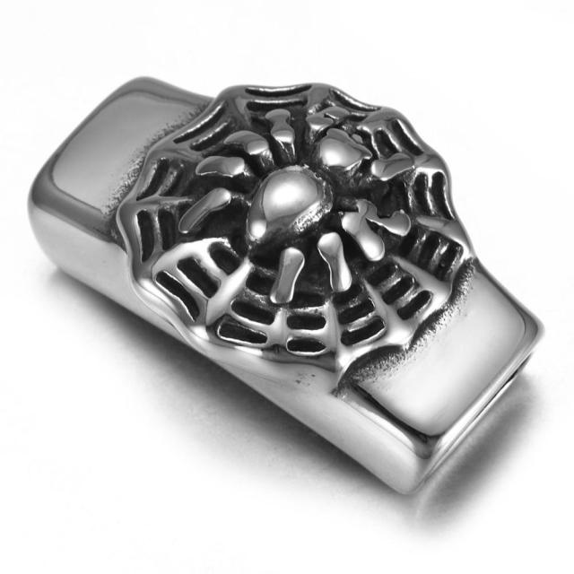クモの巣と蜘蛛をモチーフにしたかっこいい12ミリx6ミリの平らな皮ひもを通せるサージカルステンレス316L製のステンレスパーツ。