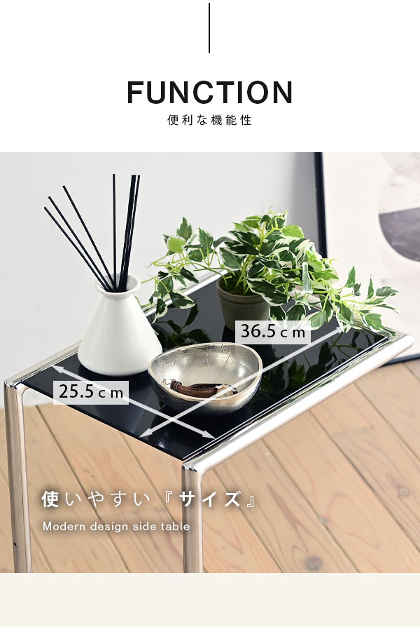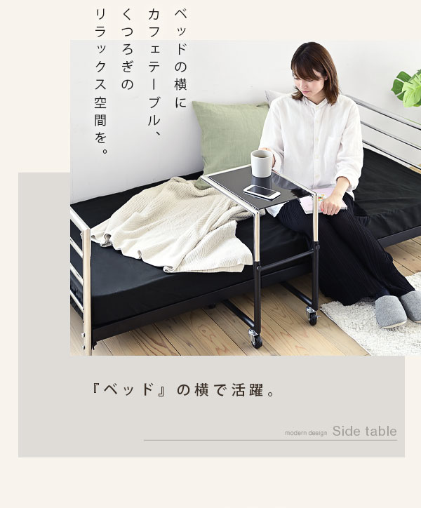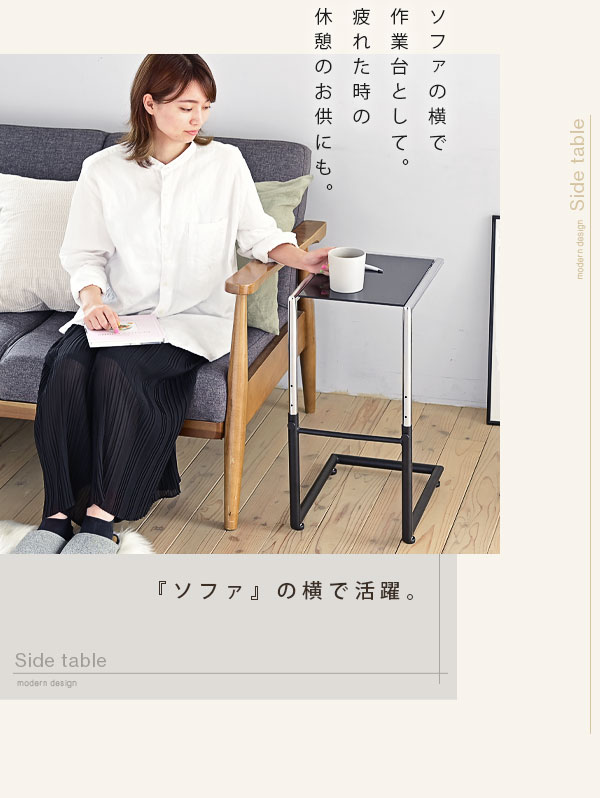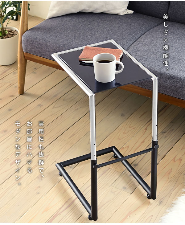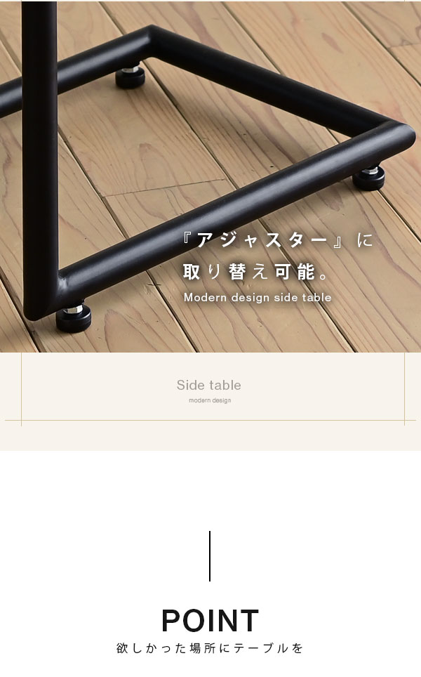 クールなデザインが印象的なサイドテーブル。高さ調節ができるので使いたいサイズに合わせられます。キャスターとアジャスター、どちらも付属しているので使用シーンに合わせて使い分けができます。