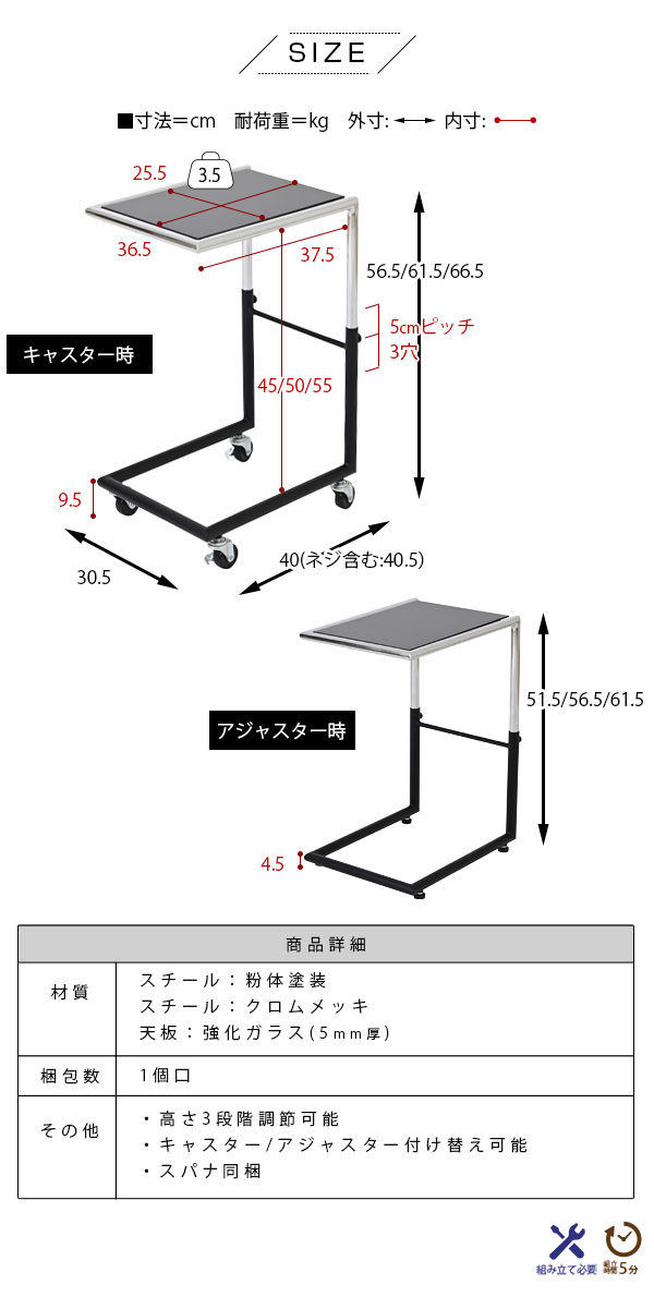 (天板ガラス)幅25.5x奥行36.5x高さ56.5/61.5/66/5cm