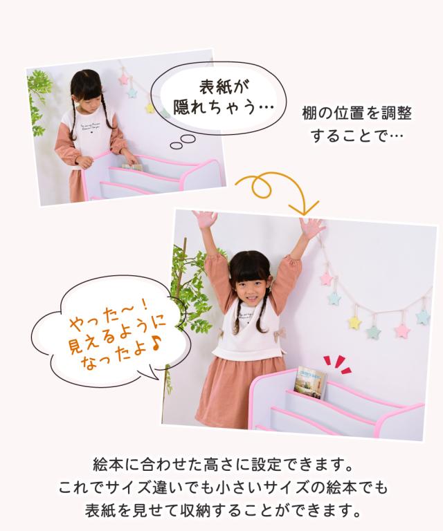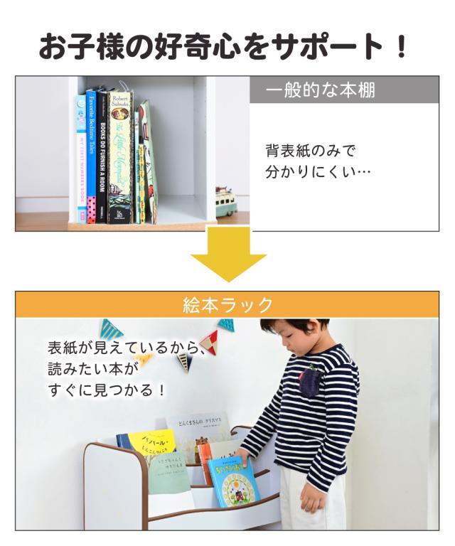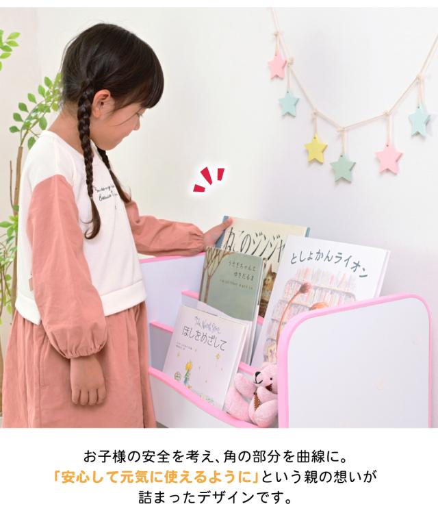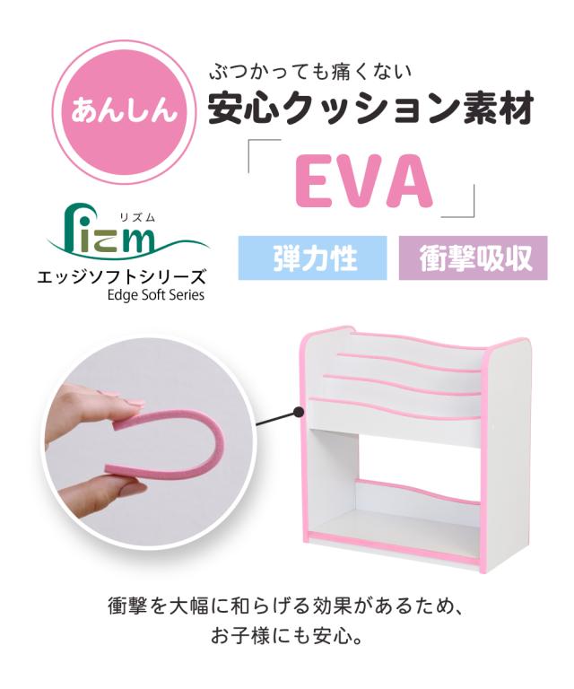 弾力性、衝撃吸収に優れたEVA樹脂をすべてのフチに採用。さらに角を丸くして金具の使用を極力減らした、小さなお子様も安全にご使用いただけるシリーズです。お子様の目線に合わせた絵本ラックは、表紙が見えるので自分で読みたい絵本を選べます。サイズがバラバラの絵本も綺麗に収納できる可動棚を採用。