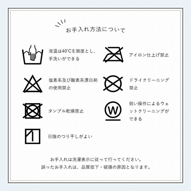 | 洗濯表示 | 液温は40℃を限度とし、手洗いができる。(洗濯機は使用できません) 干し方=日陰のつり干しがよい。 |