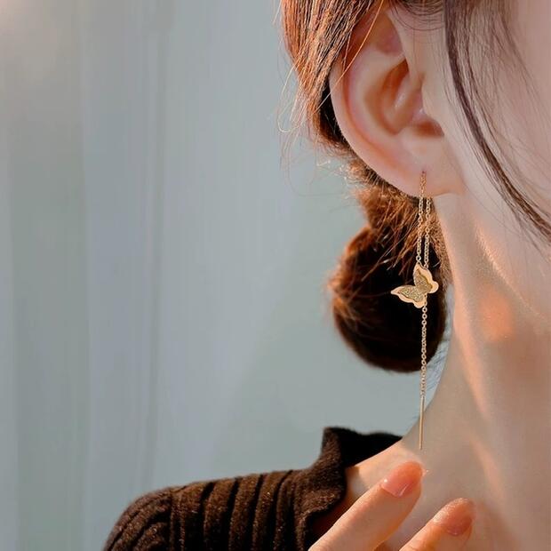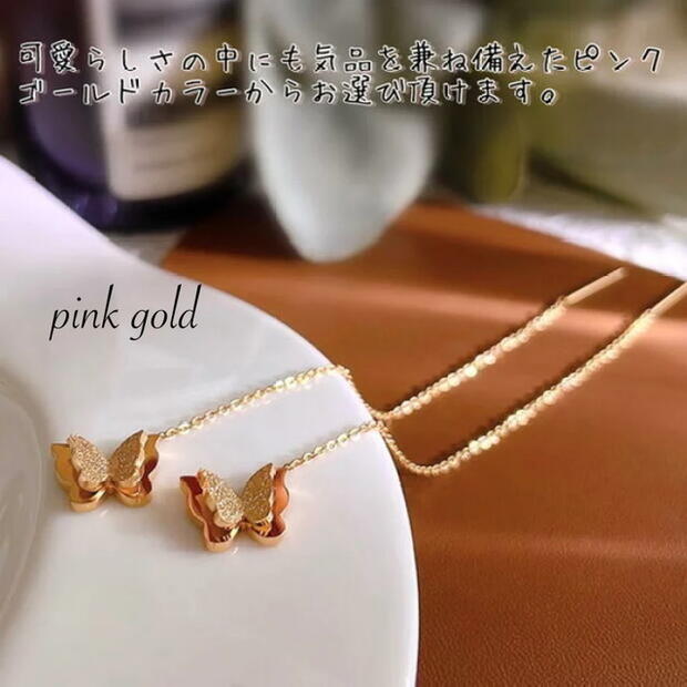 - 私は、耳たぶが厚いのでアメリカンタイプのピアスでも、外れやすいのですが、これはチェーンが長くて良かった。小さな蝶々も愛らしい??