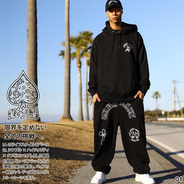 ACEFLAG 上下セット 長袖 ブランド メンズ 春秋冬用 黒/白 大きいサイズ エースフラッグ セットアップ パーカー フーディ スウェット 上下 裏パイル スウェットパンツ ゆったり おしゃれ クロス b系 ヒップホップ AF-SE-PA-020