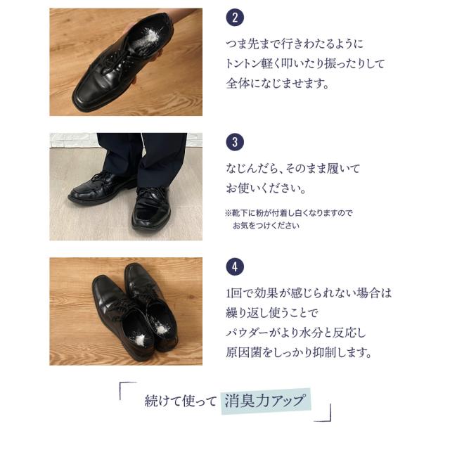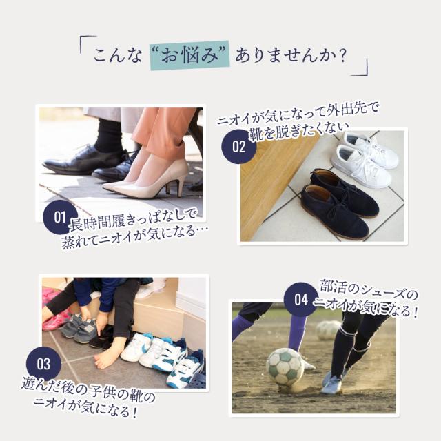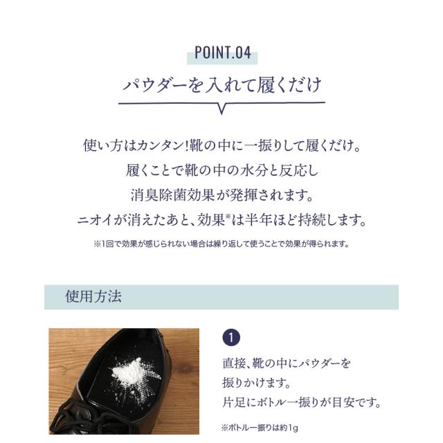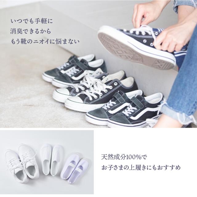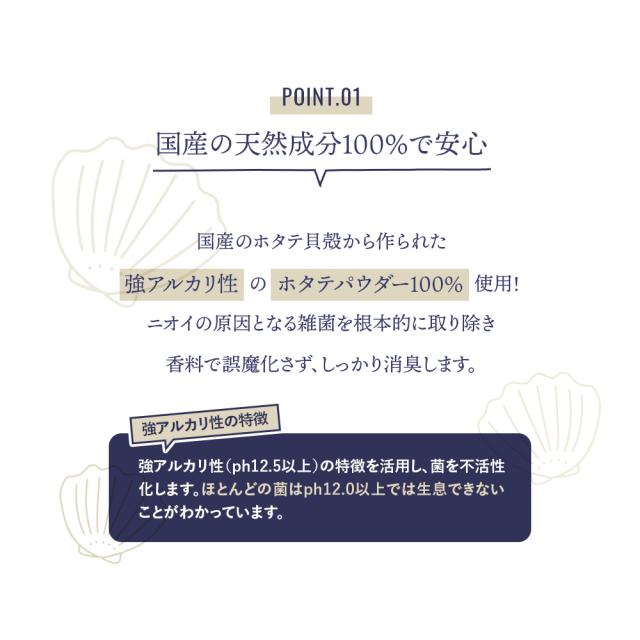 | 商品の特徴 | ・貝殻由来の天然成分100% 無香料・無着色なのにしっかり除菌・消臭。口に入っても大丈夫。 (※除菌、消臭、カビ抑制、安全性については試験を行なっています。) ・革靴、スニーカー、パンプス、上履きなど、あらゆる靴に。ニオイを元から断ち、しっかり除菌します。 (※すべての菌を除菌するわけではございません。) ・人と環境にやさしい消臭・除菌剤です。 |