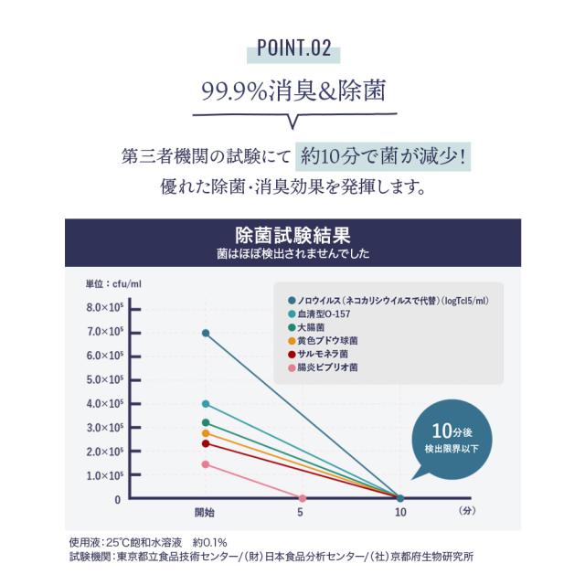 | 使用上の注意 | ※アルミ製品には使用しないでください。 ※色落ちしやすいもの、シミの心配のあるものには使用しないでください。 ※目や喉の粘膜に付着した場合は多量の水で洗い流し、異常を感じた場合は直ちに医師にご相談ください。 ※塩素系除菌剤・漂白剤と同時に使用することはおやめください。 ※スプレーで使用する場合は吹き付け箇所が素材により白残りする場合があります。 ※アレルギー体質、皮膚の弱い方は使用前に医師にご相談ください。 ※使用後は蓋を閉め、湿気の少ないところで保管してください。 |