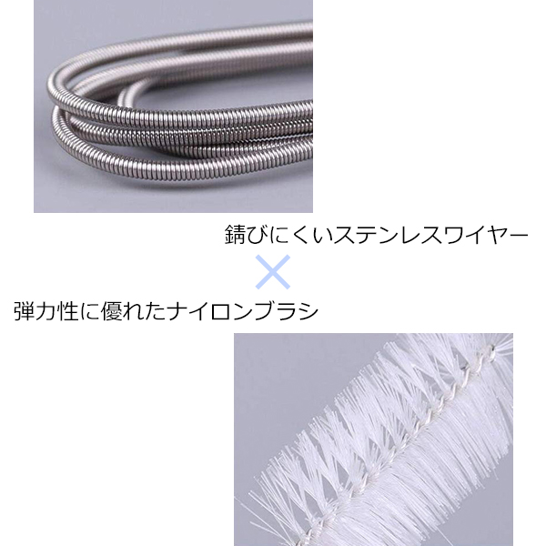 ワイヤー部分はステンレス製で錆びにくく、ブラシ部分はナイロン製なのでパイプ内も傷つきにくい仕様です。