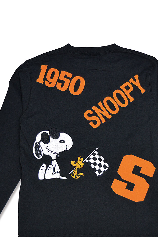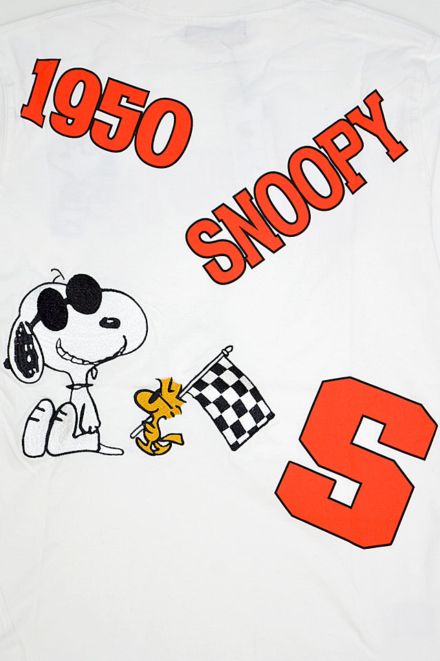 フロントバック共に、お揃いのサングラスをかけたスヌーピーとウッドストックを刺繍。
