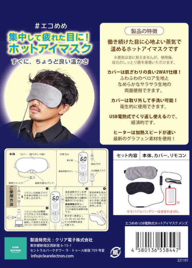 アイマスク USB電熱式 ホットアイマスク USB給電式 温度設定3段階 4段階タイマー 繰り返し使える 2WAYカバー 安眠 目元 しっとり ケア リラックス エコめめ メンズ CLEAR ELECTRON 4580136558447