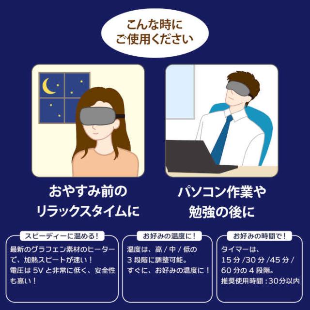 働き続けた目を心地よい蒸気で温めるホットアイマスクです。※蒸気は目に見えませんが、使用後、目元のしっとり感を実感いただけます。カバーは取り外して手洗い可能。衛生的に使用できます。USB電熱式で繰り返し使えるので、経済的です。ヒーターは加熱スピードが速い最新のグラフェン素材を使用。お休み前のリラックスタイムや、パソコン作業・勉強の後にご使用ください。
