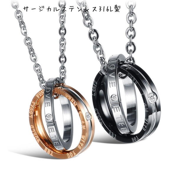 サージカルステンレス ネックレス 金属アレルギー対応 ジルコニア 2連リング ネックレス 永遠の愛 ジルコニア リング ピンクゴールド シルバー ブラック 黒色 おそろい メンズ レディース お揃いカップル ステンレス チェーンネックレス LOVE カジュアル プレゼント