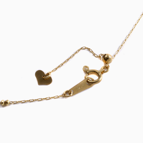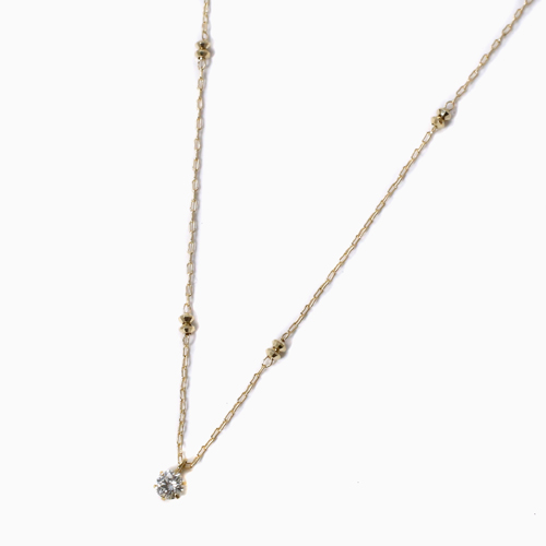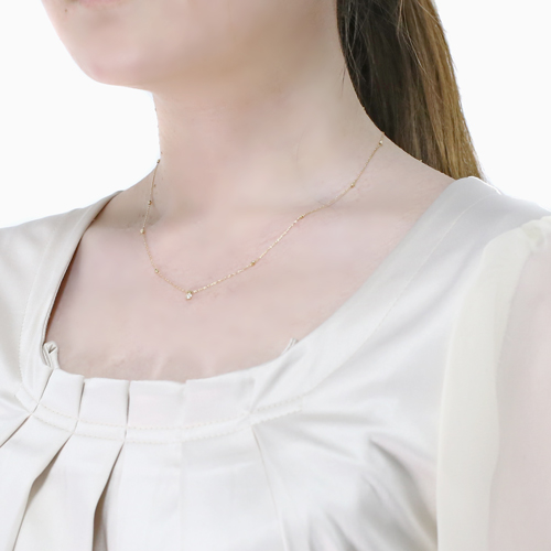 高級素材である、18金(K18)を使用した、上品で気品あふれるダイヤモンドのネックレス。細く繊細な粗目小豆チェーンのベースにステーション状にミラクルカットのミラーボールを配したデザインは可憐で厳か。決して自己主張をしない、人とは違うちょっとオシャレなチェーンをお探しの方におススメです。また、お手持ちの長さや色違いで2本や3本と重ね着けでお使いいただけるように41cmから45cmにお好みの長さに調整できるシリコンスライド仕様になっています。普段の装いをぐっとエレガントに引き立ててくれます。センター部分にはホワイト系の天然ダイヤモンドを1石付けて華やかさを演出しています。