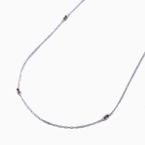 高級素材である、プラチナ(Pt850)を使用した、上品で気品あふれるロングタイプのネックレス。細く繊細な粗目小豆チェーンのベースにステーション状にミラクルカットのミラーボールを配したデザインは可憐で厳か。決して自己主張をしない、人とは違うちょっとオシャレなチェーンをお探しの方におススメです。また、長さや色違いで2本や3本お使いいただけるように60cmから70cmにお好みの長さに調整できるシリコンスライド仕様になっています。普段の装いをぐっとエレガントに引き立ててくれます。