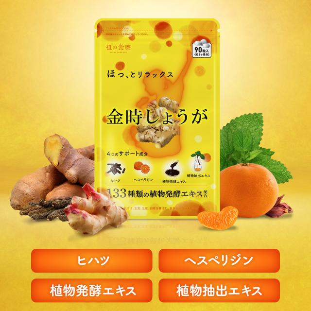 ≪原材料≫デキストリン(国内製造)、還元麦芽糖水飴、金時生姜末、植物発行エキス末、ヒハツエキス末、 植物抽出エキス末(ミツカトウ、ベニバナ、クチナシ果実、アサ種子、ナツメ果実、ダイダイ果実、 ショウガ、カンゾウ、ハッカ)/セルロース、ステアリン酸Ca、微粒酸化ケイ素、HPC、ヘスペリジン、 (一部にりんご・大豆・キウイフルーツ・ももを含む)