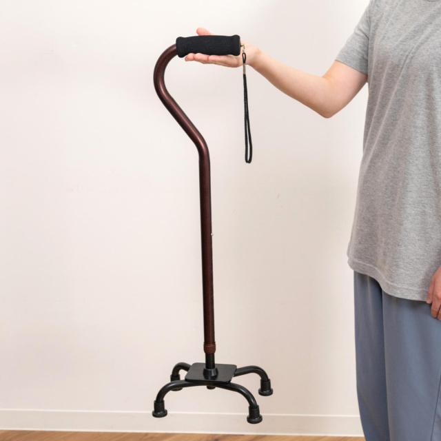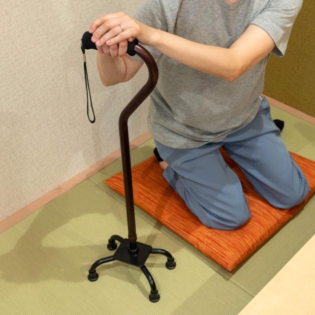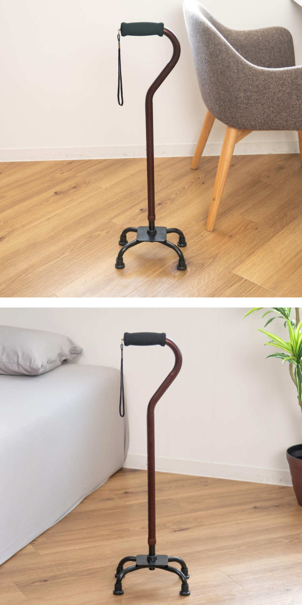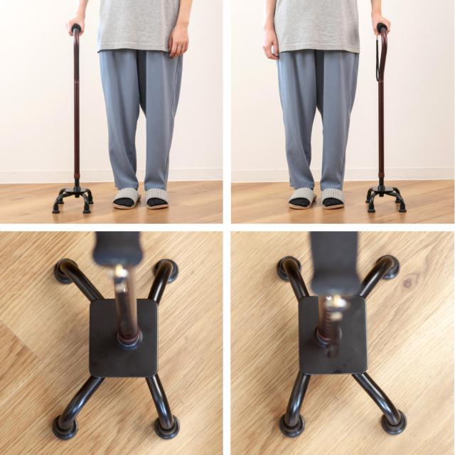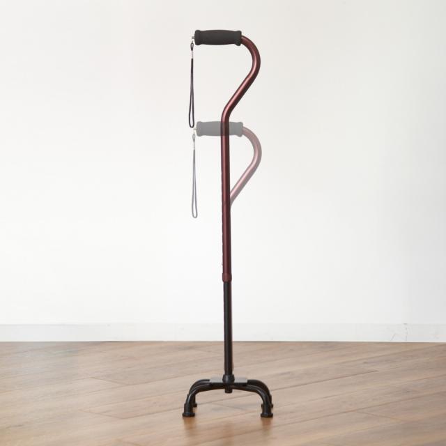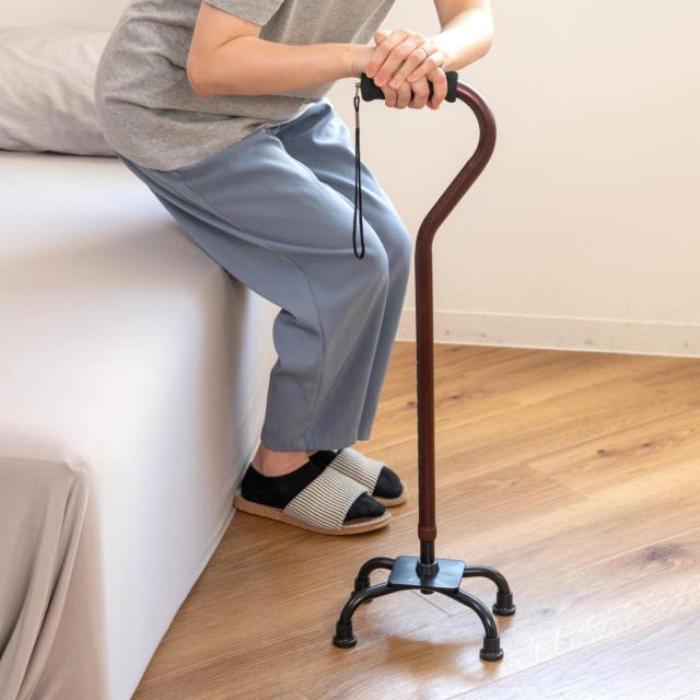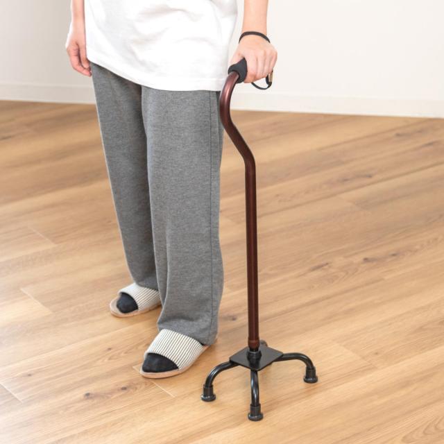 4点で支えるため接地面が広くなり、安定した歩行をサポートする4点杖です。立ち座りの動作も体重をしっかりかけられるので、楽にできます。室内など平坦な場所での利用に適しており、一本杖では歩行が不安定な方、筋力低下や麻痺のある方におすすめです。