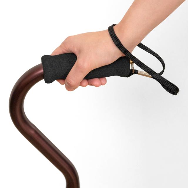 手首にストラップを通して使うと、不安定な場所で杖から手を放しても杖が倒れず安心です。