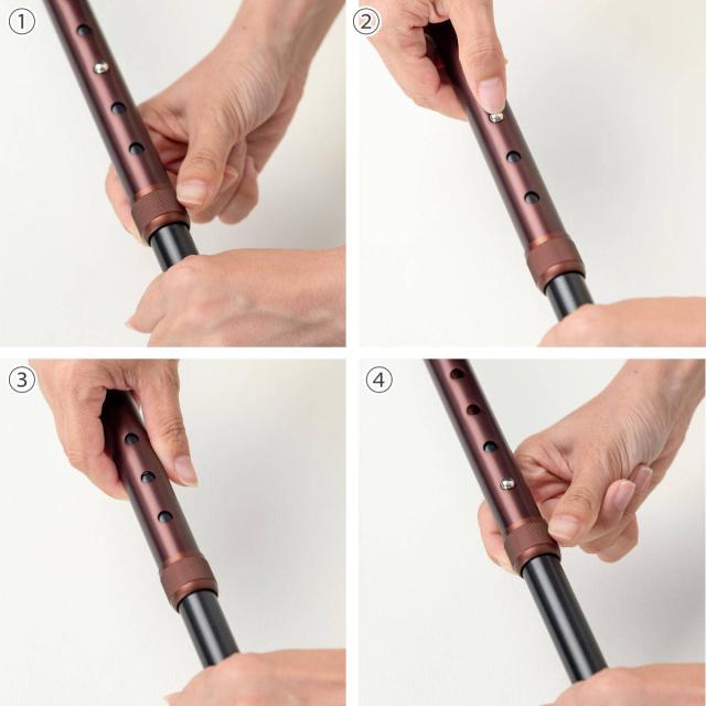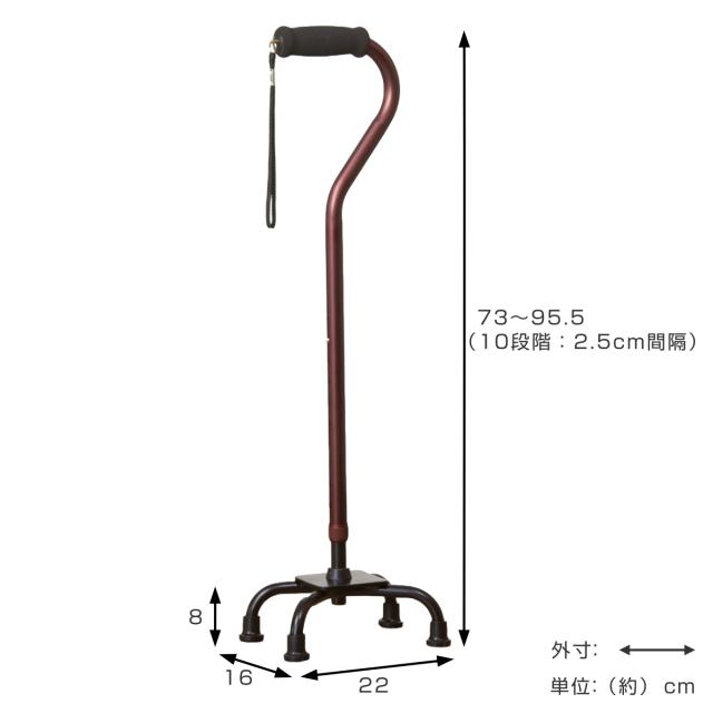 | サイズ | 約73〜95.5(cm) 10段階調節・2.5cmピッチ 脚部:約 幅16×奥行22×高さ8(cm) 杖先ゴム:四点杖用TPR |