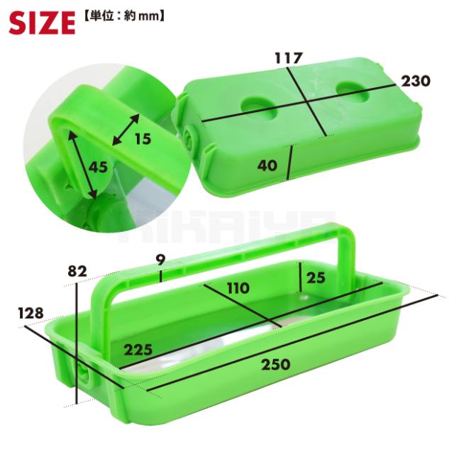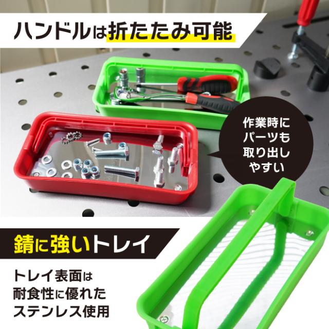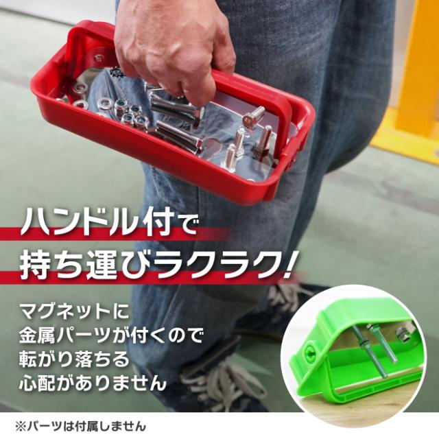パーツの整理と持ち運びに!ハンドル付マグネットトレイ ●金属パーツをマグネットで吸着・保持できるトレイです ●ハンドル付きで持ち運びに便利!マグネット吸着でパーツが転がり落ちる心配もありません ●ハンドルは折りたためるので、作業時にパーツも取り出しやすい ●トレイ表面は耐食性に優れたステンレスを使用 ●金属製の平らな面に取り付ける事で、転倒したり滑り落ちたりすることなく使用できます ●キャビネットなどスチール壁面にも取付可能! ※鉄板が薄かったり加工がしてあると吸着しにくい場合があります ●2個それぞれ色が違うので色別に使用でき、サイズ別・種類別のパーツ管理に便利です |