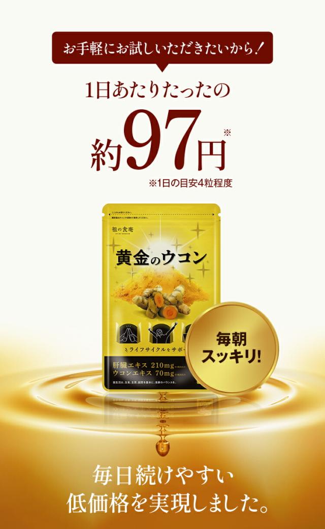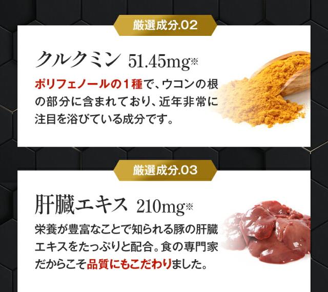 ≪原材料≫ウコン末(国内製造)、豚肝臓エキス末(豚肉を含む)、澱粉、L-オルニチン塩酸塩、ウコン抽出物/ゼラチン、 L-シスチン、セルロース、ステアリン酸Ca、微粒酸化ケイ素、リン酸三Ca、カラメル色素
