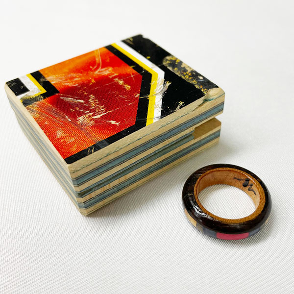 スケボーデッキの廃材をリサイクルし一点一点ハンドメイドで作られたリングです。